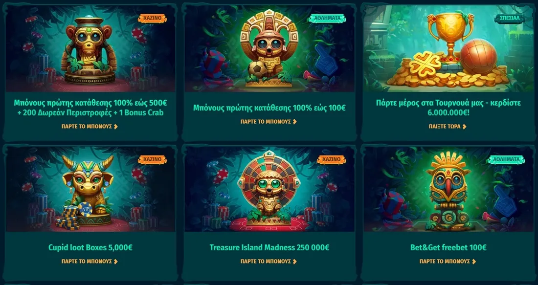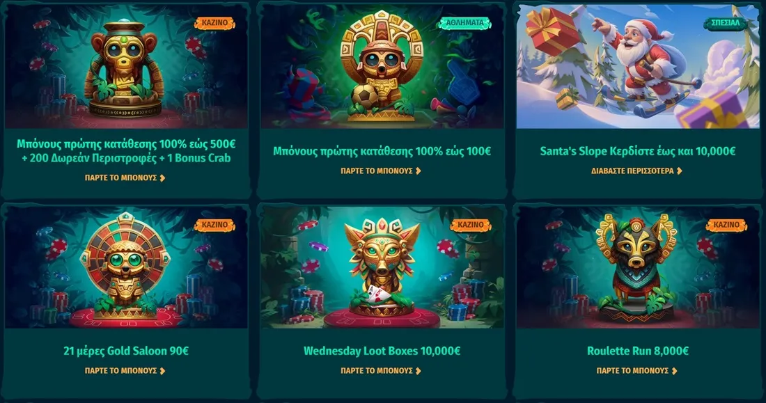 - Μπόνους καλωσορίσματος για το καζίνο – 100% έως 500 ευρώ στην κατάθεση, 200 δωρεάν περιστροφές και 1 περιστροφή για το Bonus Crab;